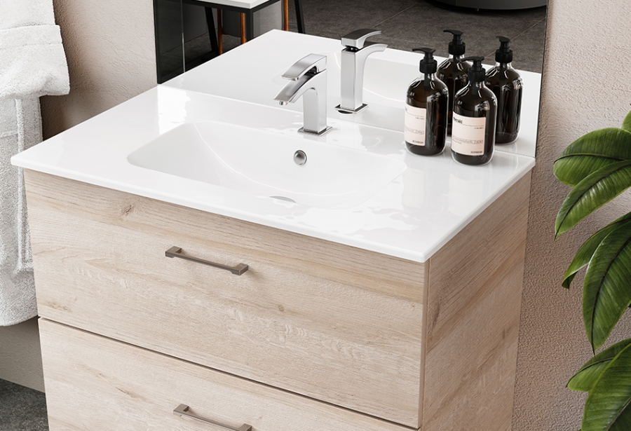 Une gamme de meubles à la surface de rangement repensée : une prise au sol réduite compensée par l’augmentation de la hauteur de caisse. Le joli plan céramique Bora offre à la fois robustesse et élégance, ainsi qu’une vasque généreuse et profonde.